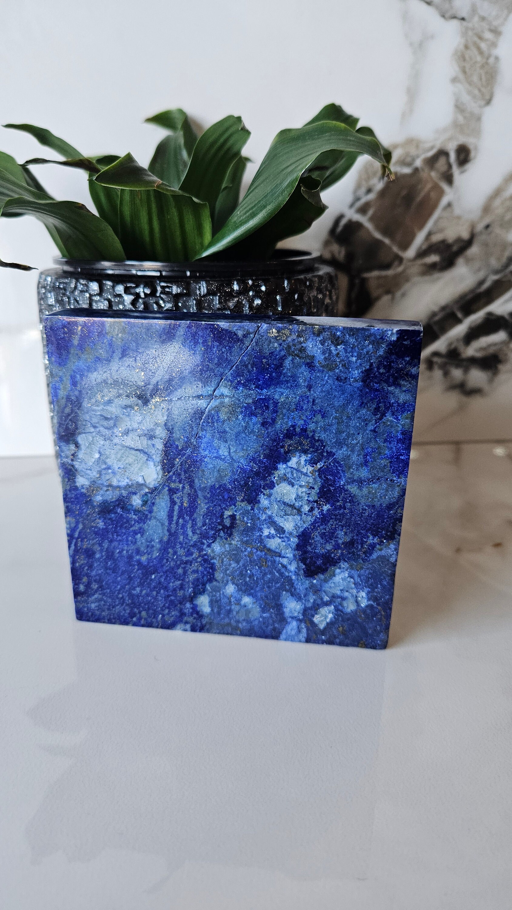 Unlike other Lapis Lazuli tiles, the ones we sell come from a whole stone for each individual pile, meaning the design of the tile is much more polished, cleaner, without a void of the royal blue theme, and it does not look like multiple small pieces of lapis were just put together. This is truly one of a kind, and is also much more durable than the mosaic ones.