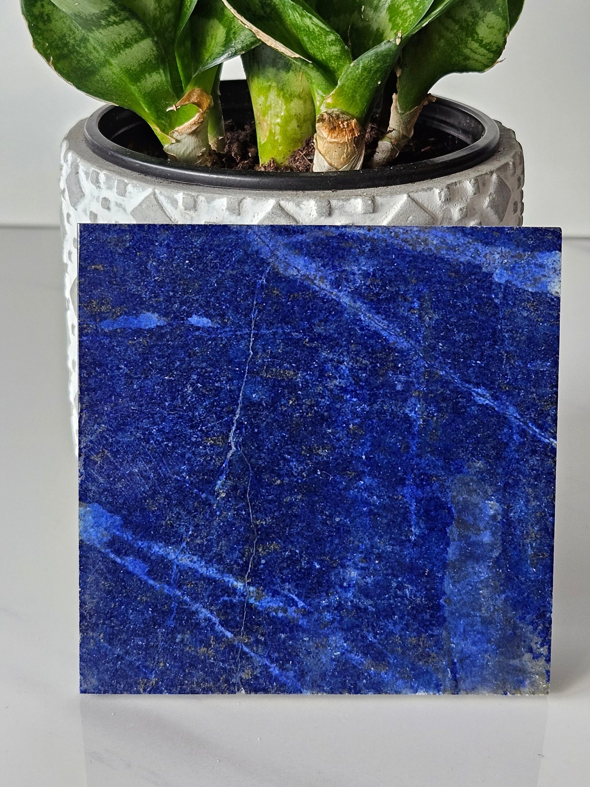 Unlike other Lapis Lazuli tiles, the ones we sell come from a whole stone for each individual pile, meaning the design of the tile is much more polished, cleaner, without a void of the royal blue theme, and it does not look like multiple small pieces of lapis were just put together. This is truly one of a kind, and is also much more durable than the mosaic ones.