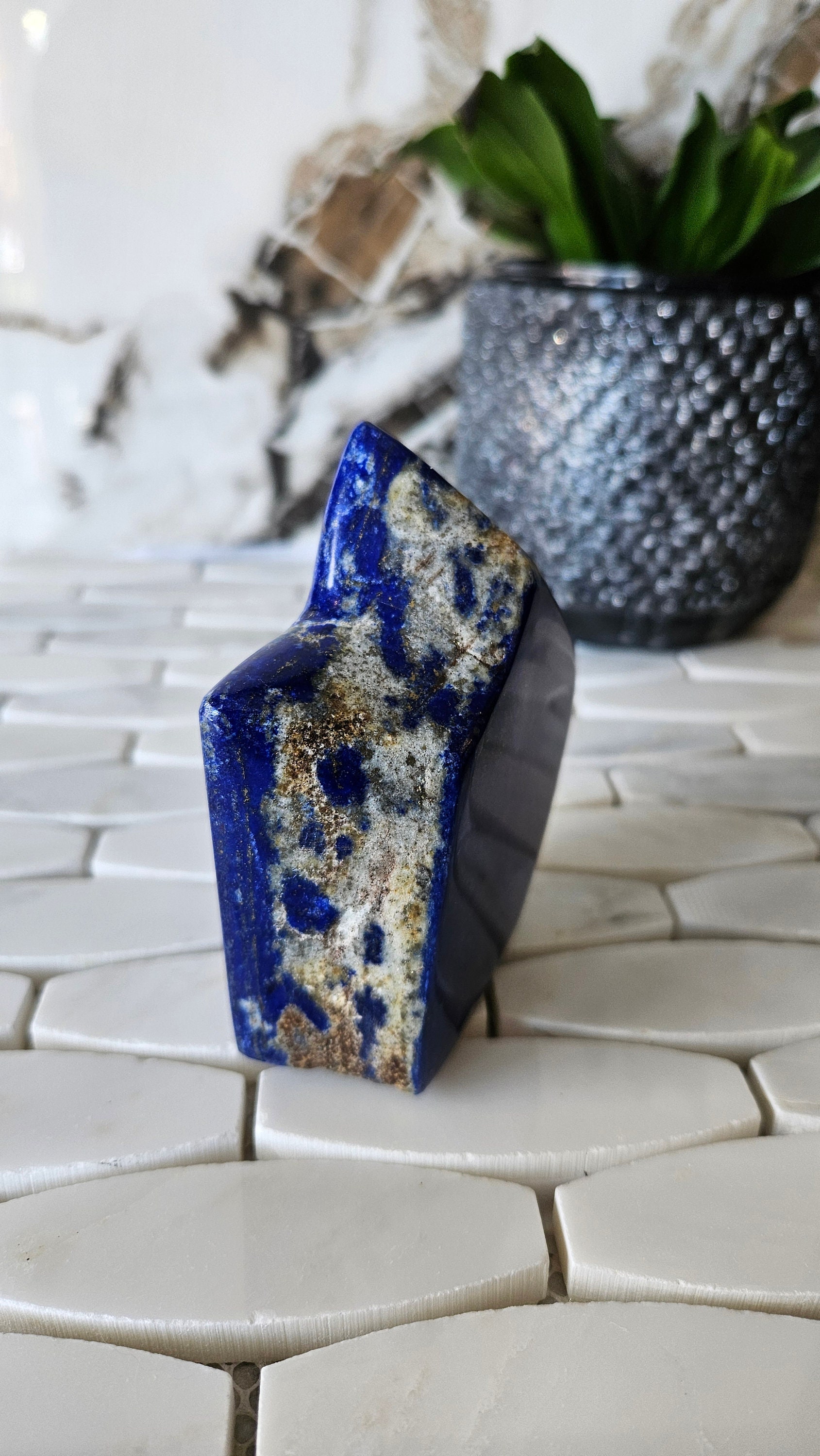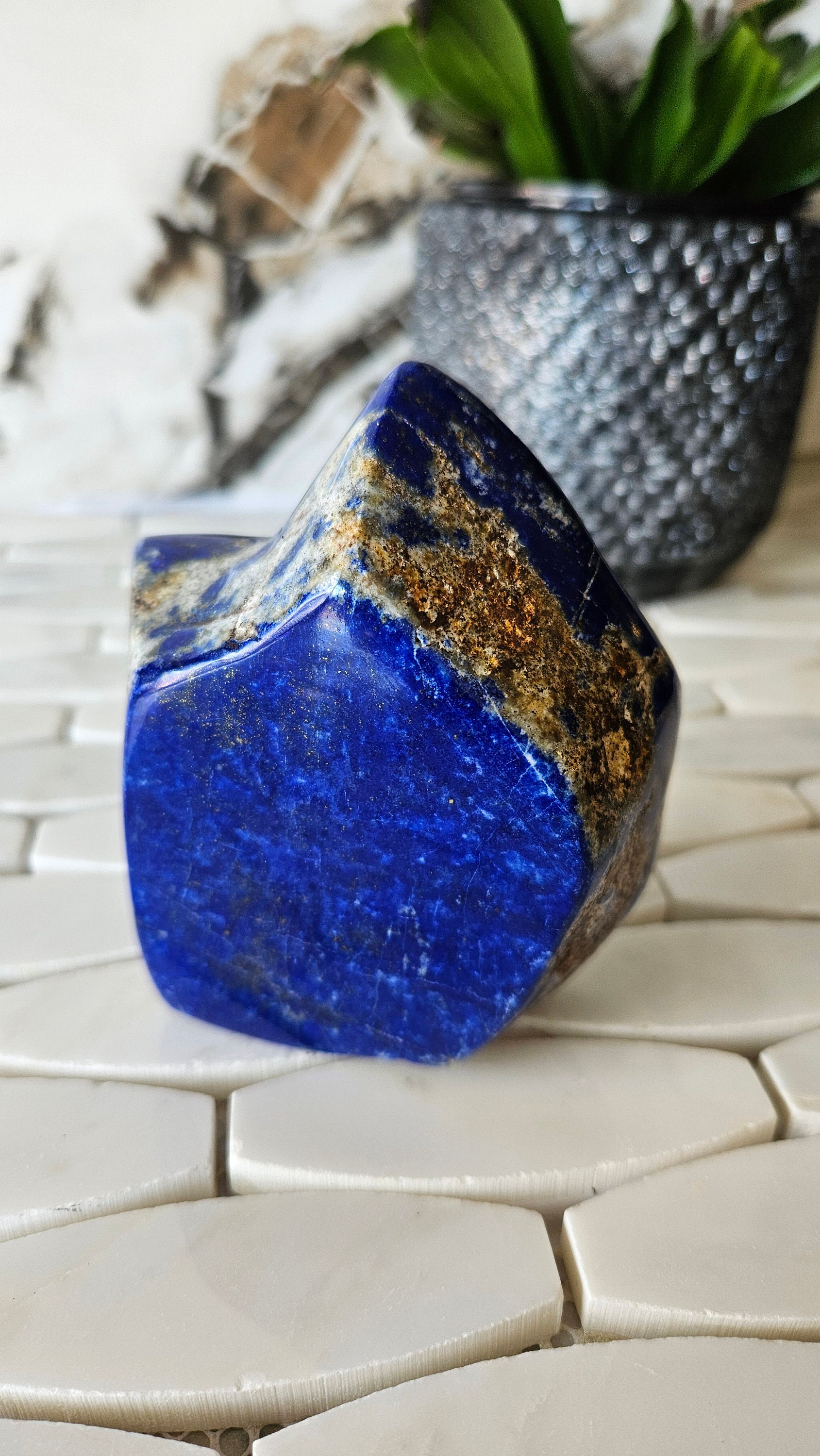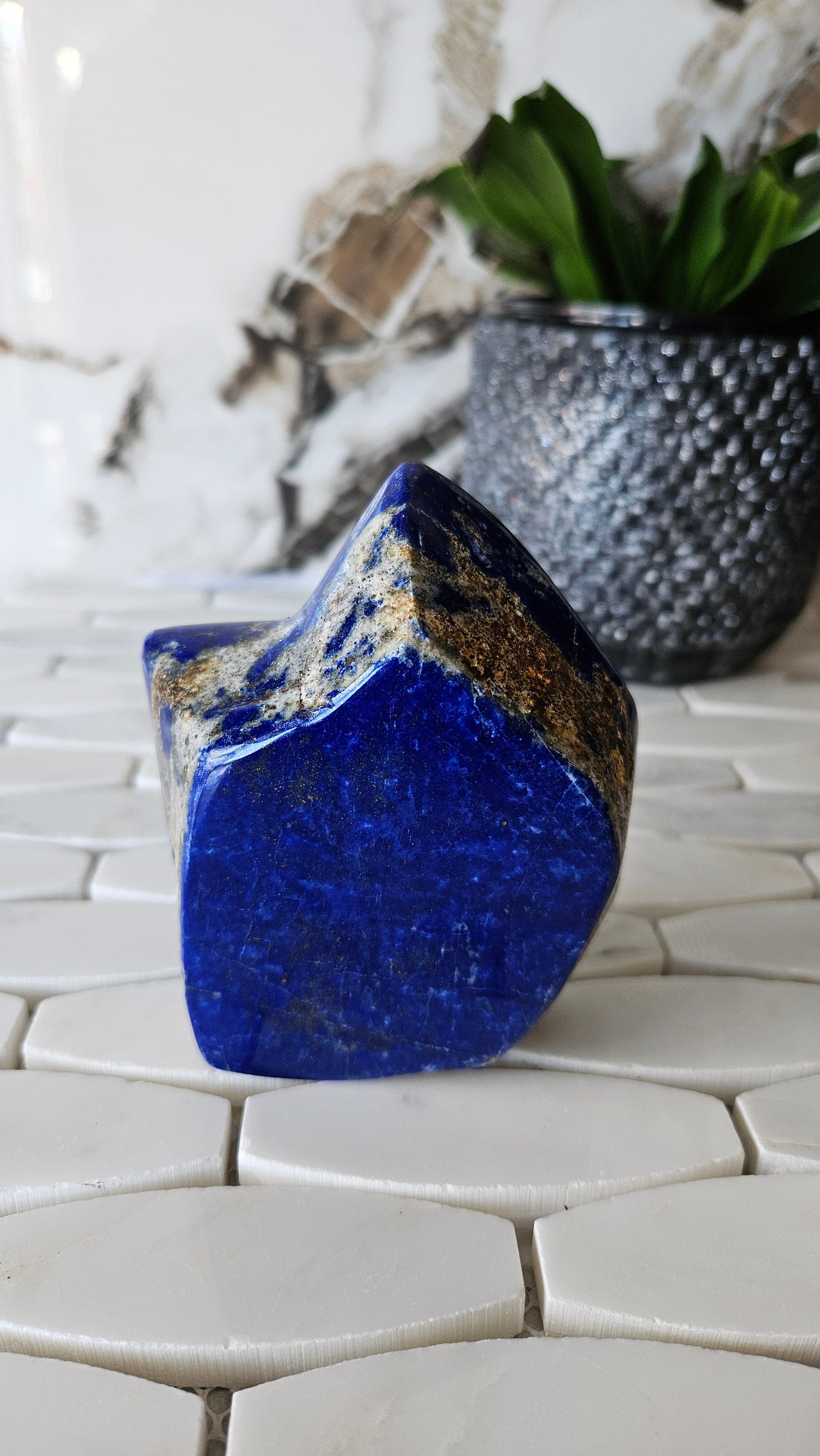 This free-form lapis lazuli is a one-of-a-kind piece that is sure to add a pop of colour to any collection. The deep blue colour of lapis lazuli is accented with flecks of gold, giving it a luxurious and unique appearance. This gemstone is highly prized for its striking beauty and has been used in jewellery and art for centuries. Its rich history and cultural significance make it a truly special piece to own.