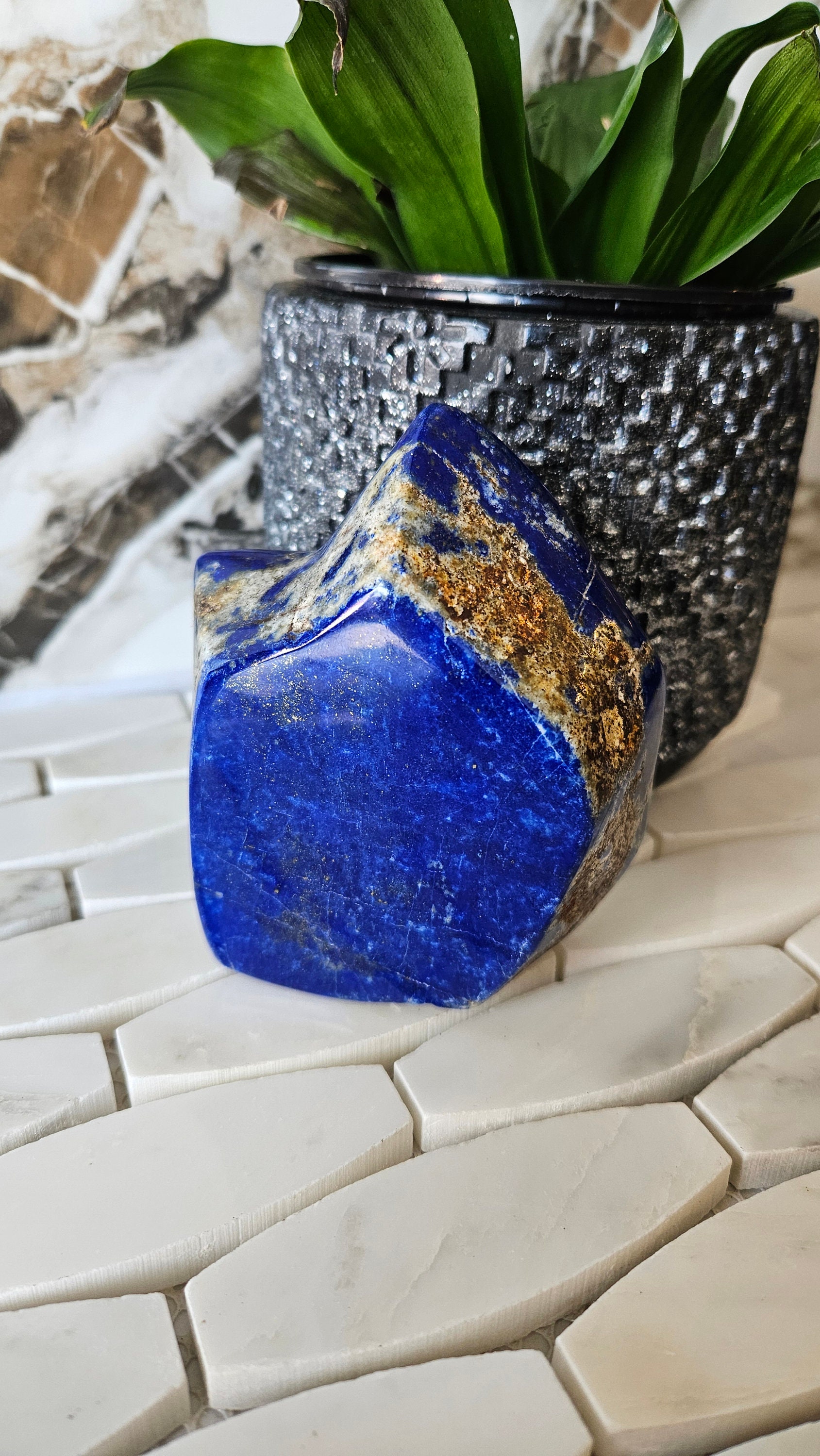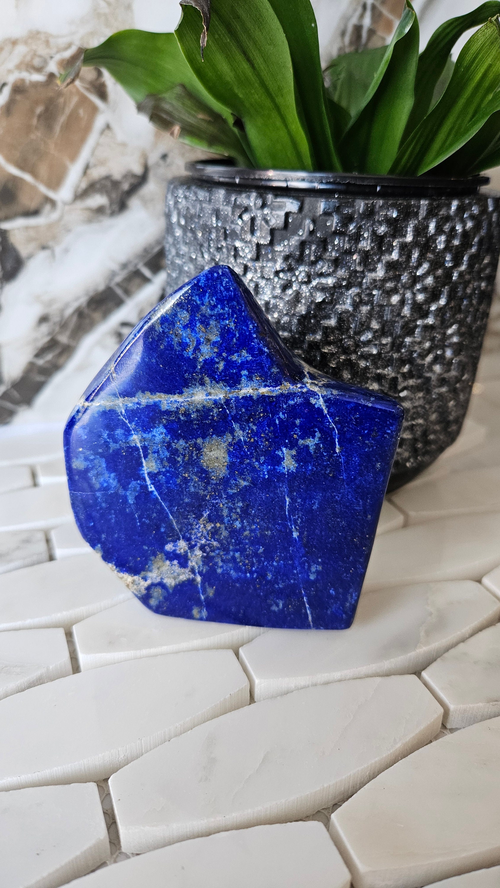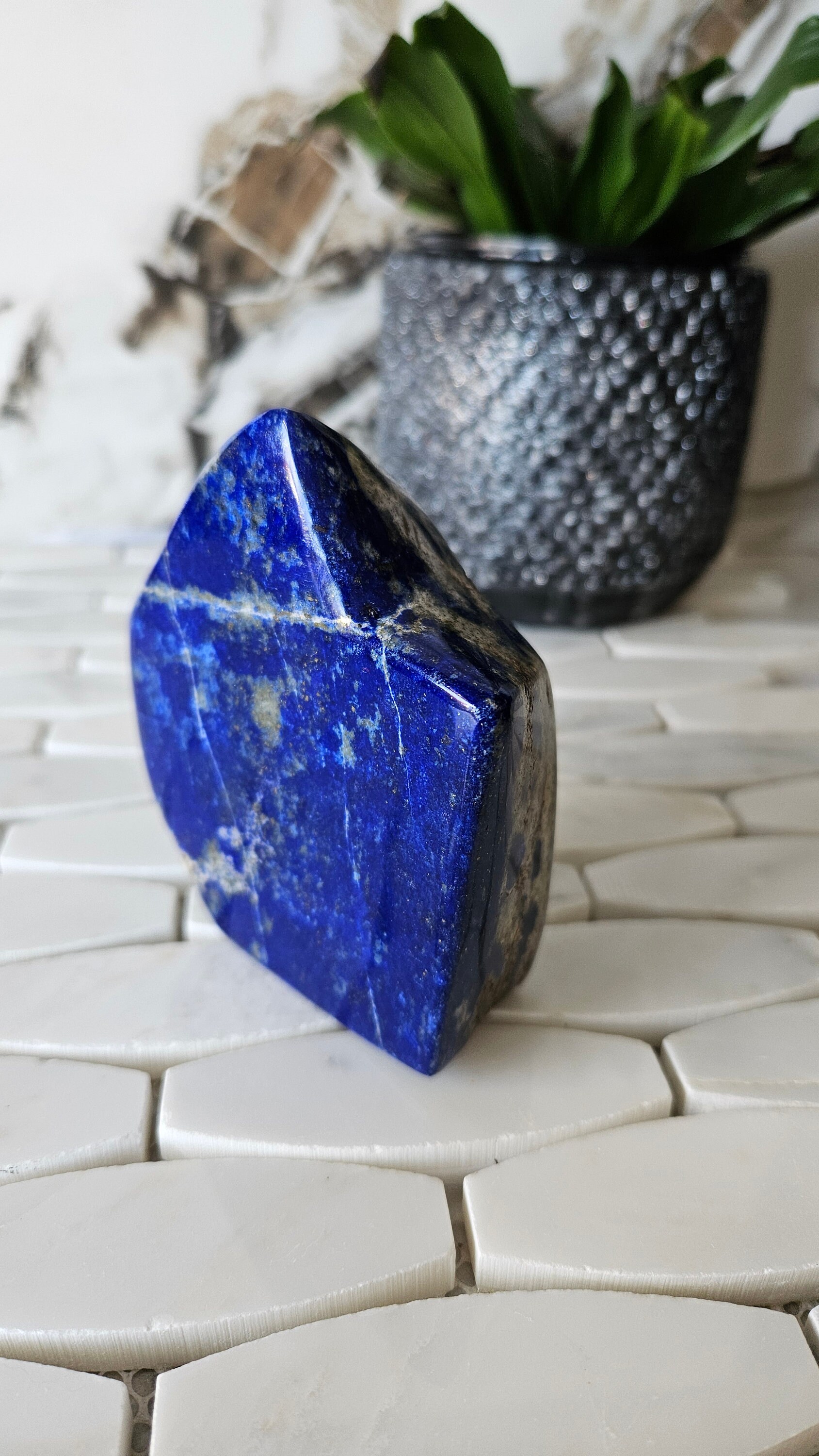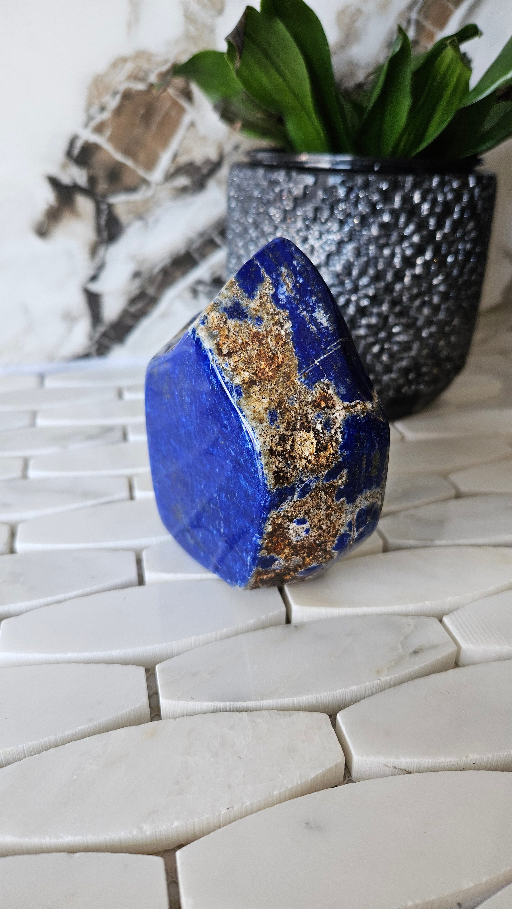 This free-form lapis lazuli is a one-of-a-kind piece that is sure to add a pop of colour to any collection. The deep blue colour of lapis lazuli is accented with flecks of gold, giving it a luxurious and unique appearance. This gemstone is highly prized for its striking beauty and has been used in jewellery and art for centuries. Its rich history and cultural significance make it a truly special piece to own.
