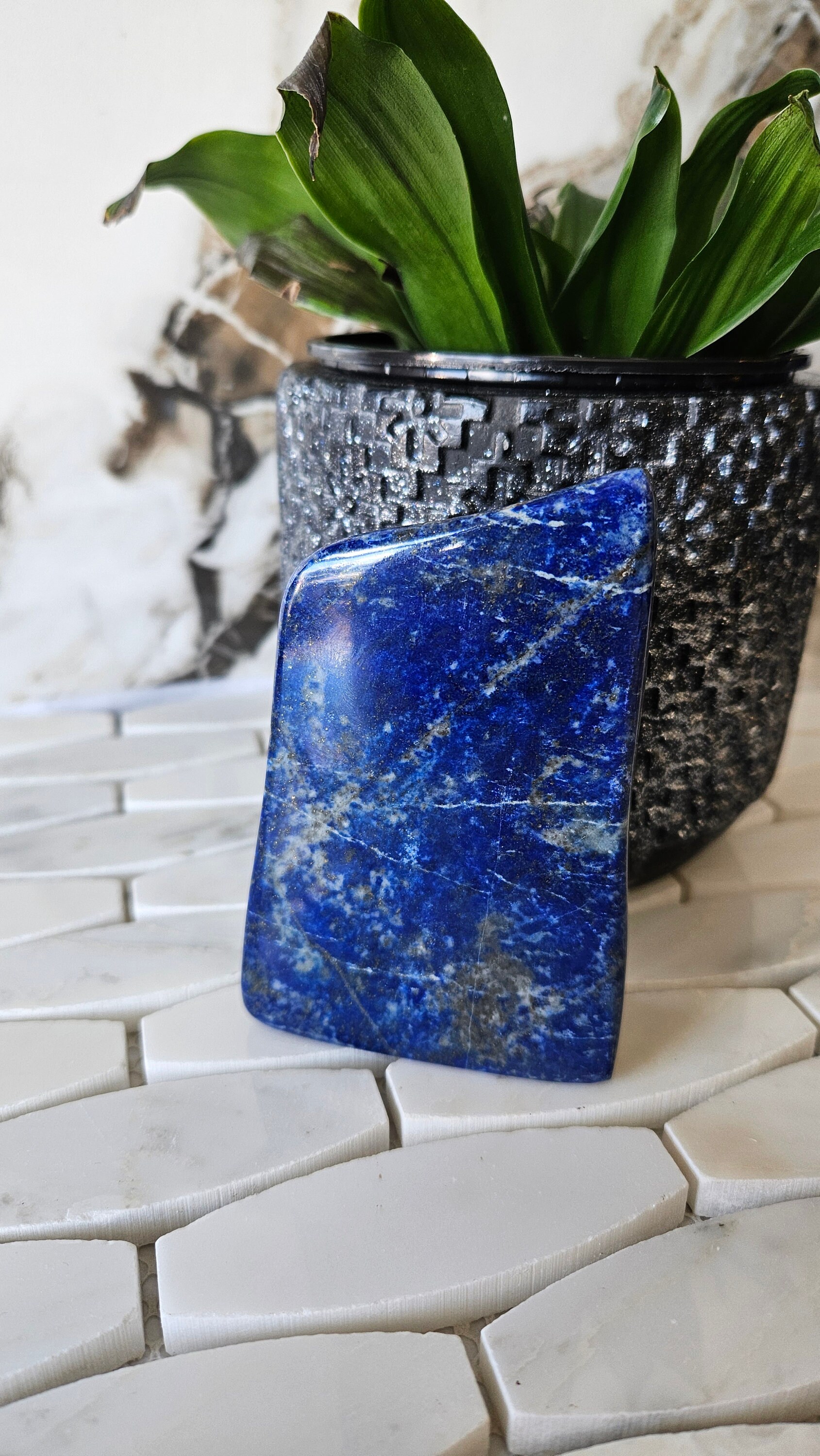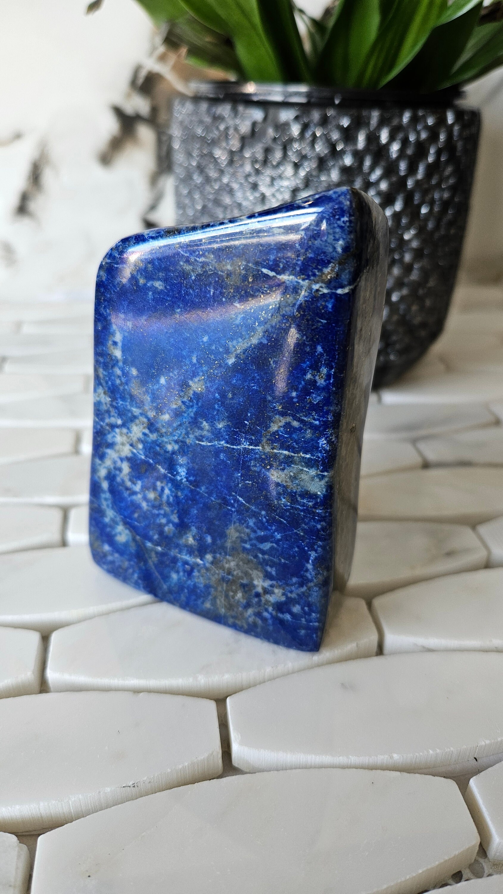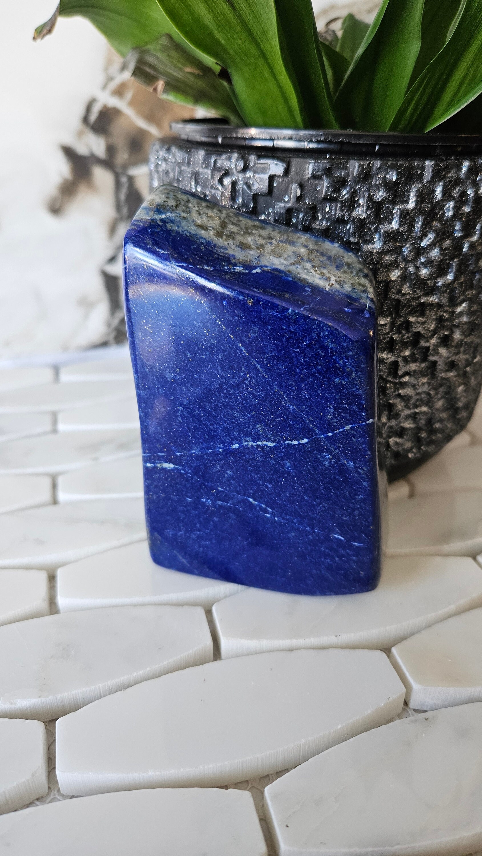 This free-form lapis lazuli is a one-of-a-kind piece that is sure to add a pop of colour to any collection. The deep blue colour of lapis lazuli is accented with flecks of gold, giving it a luxurious and unique appearance. This gemstone is highly prized for its striking beauty and has been used in jewellery and art for centuries. Its rich history and cultural significance make it a truly special piece to own.