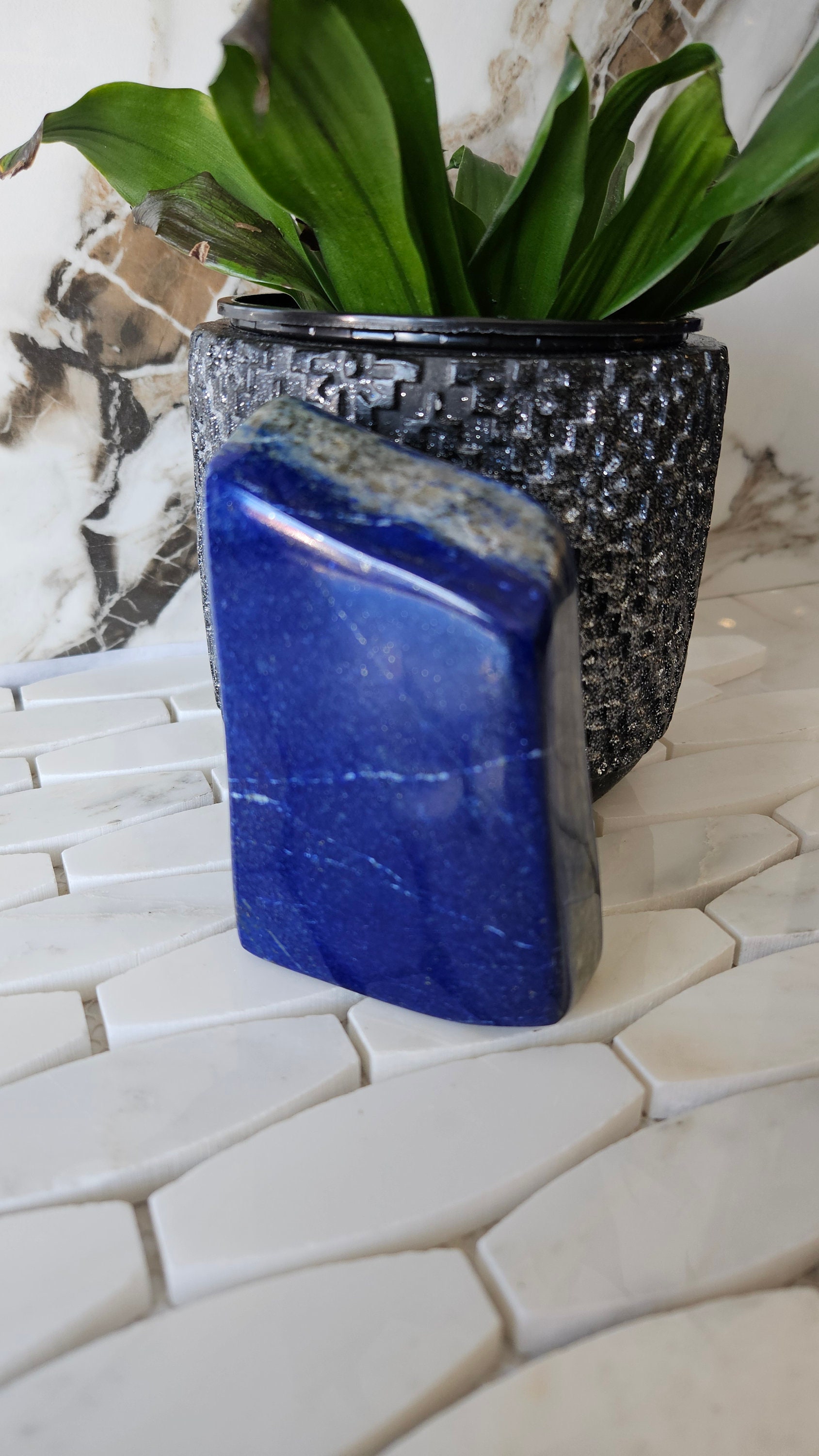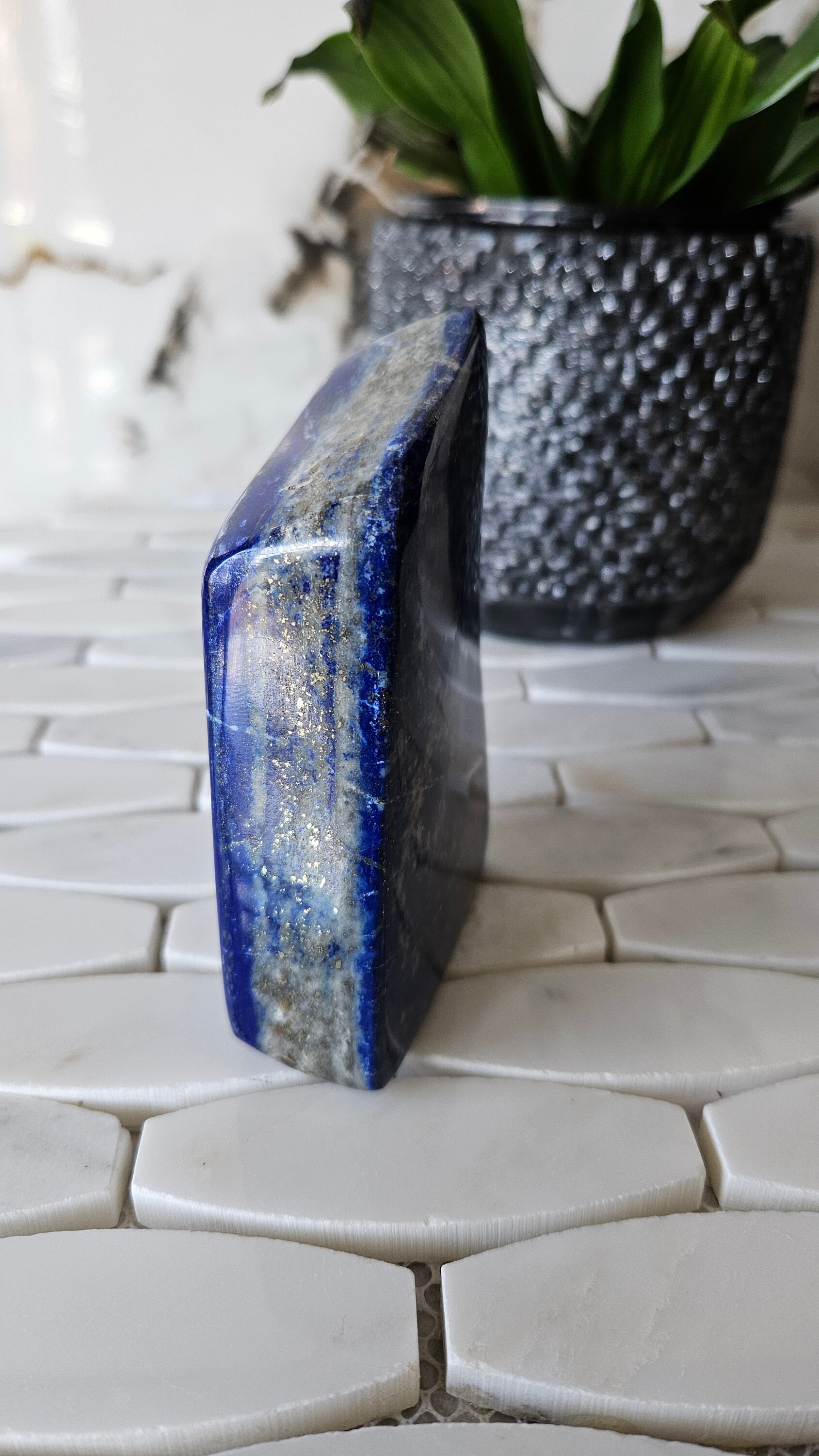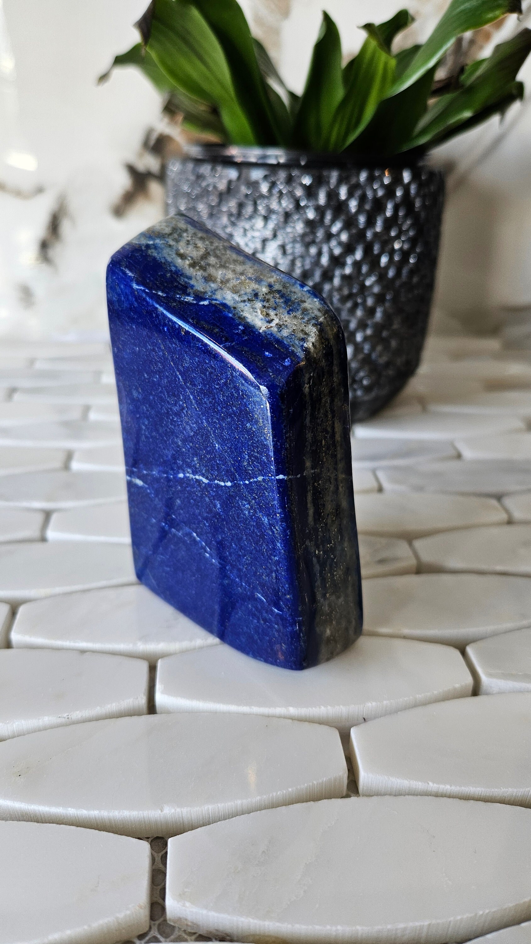 This free-form lapis lazuli is a one-of-a-kind piece that is sure to add a pop of colour to any collection. The deep blue colour of lapis lazuli is accented with flecks of gold, giving it a luxurious and unique appearance. This gemstone is highly prized for its striking beauty and has been used in jewellery and art for centuries. Its rich history and cultural significance make it a truly special piece to own.