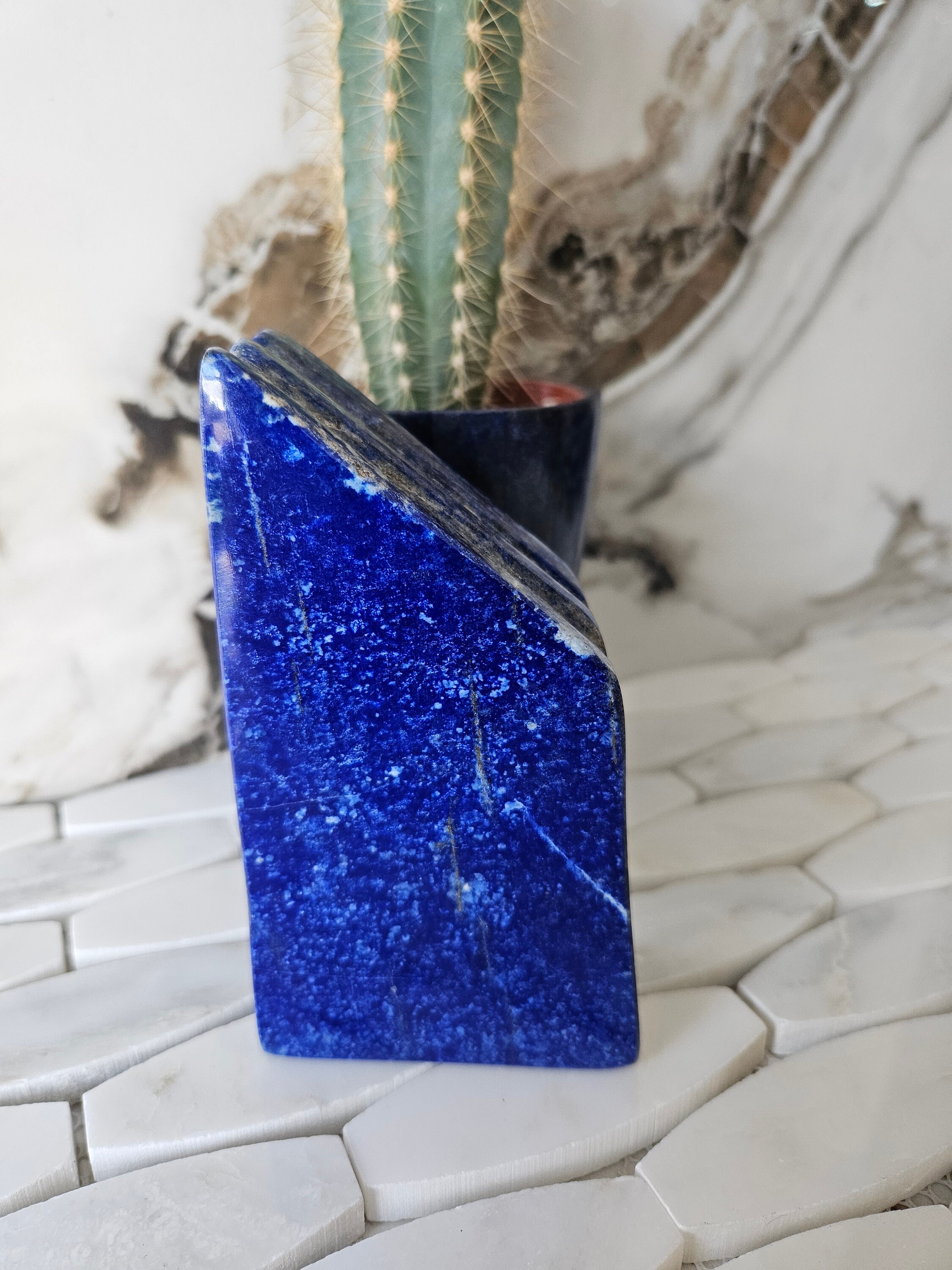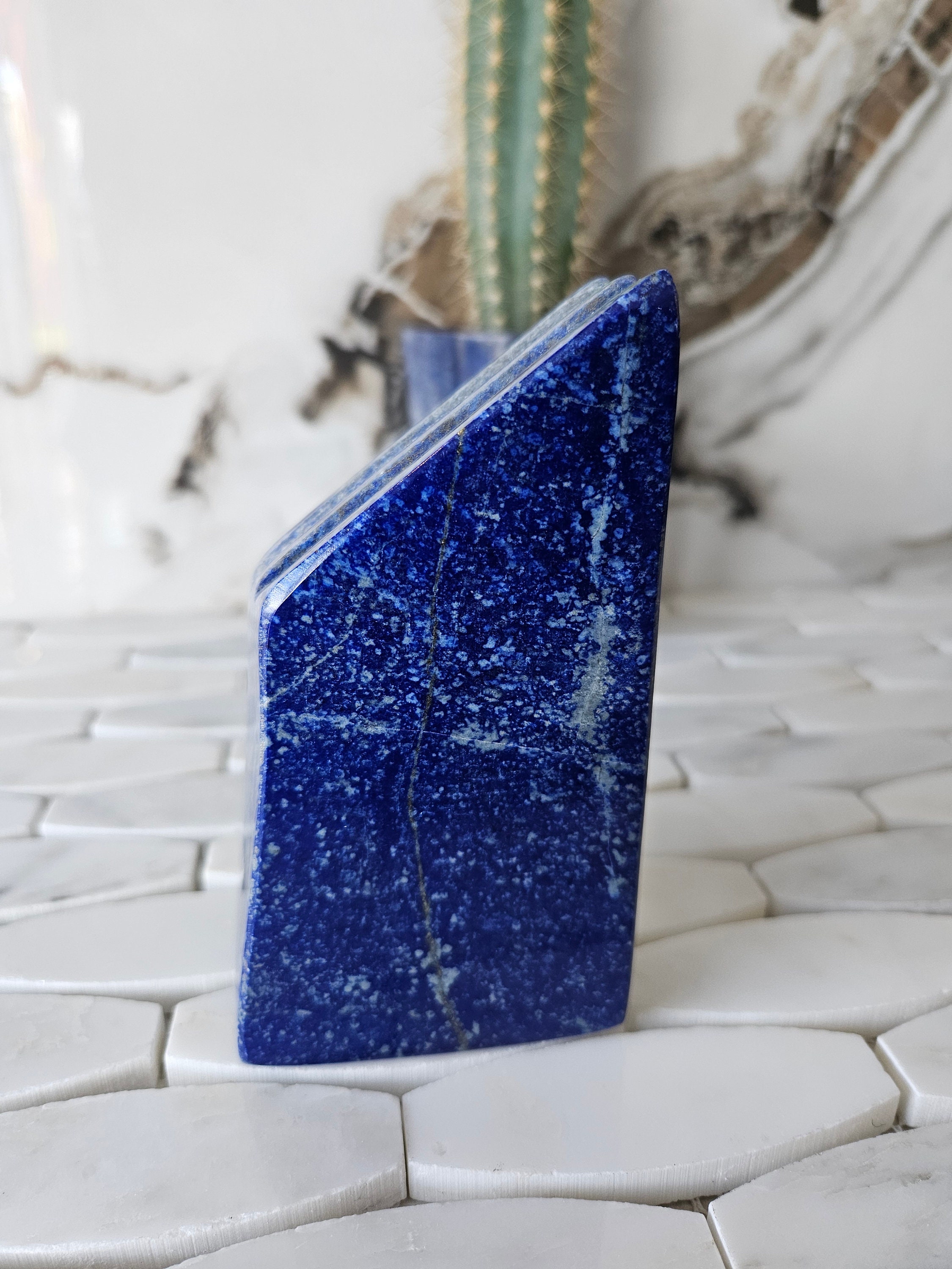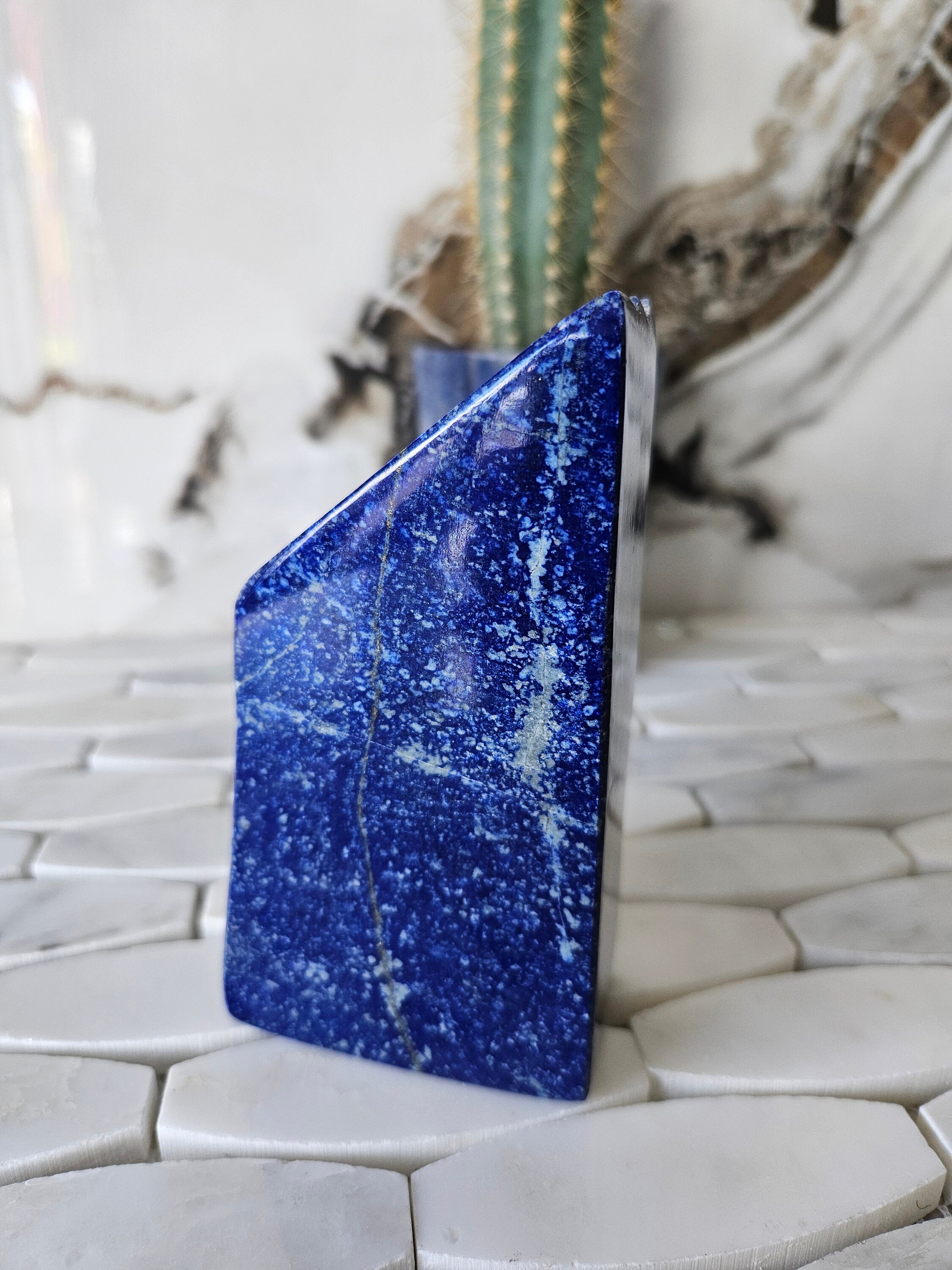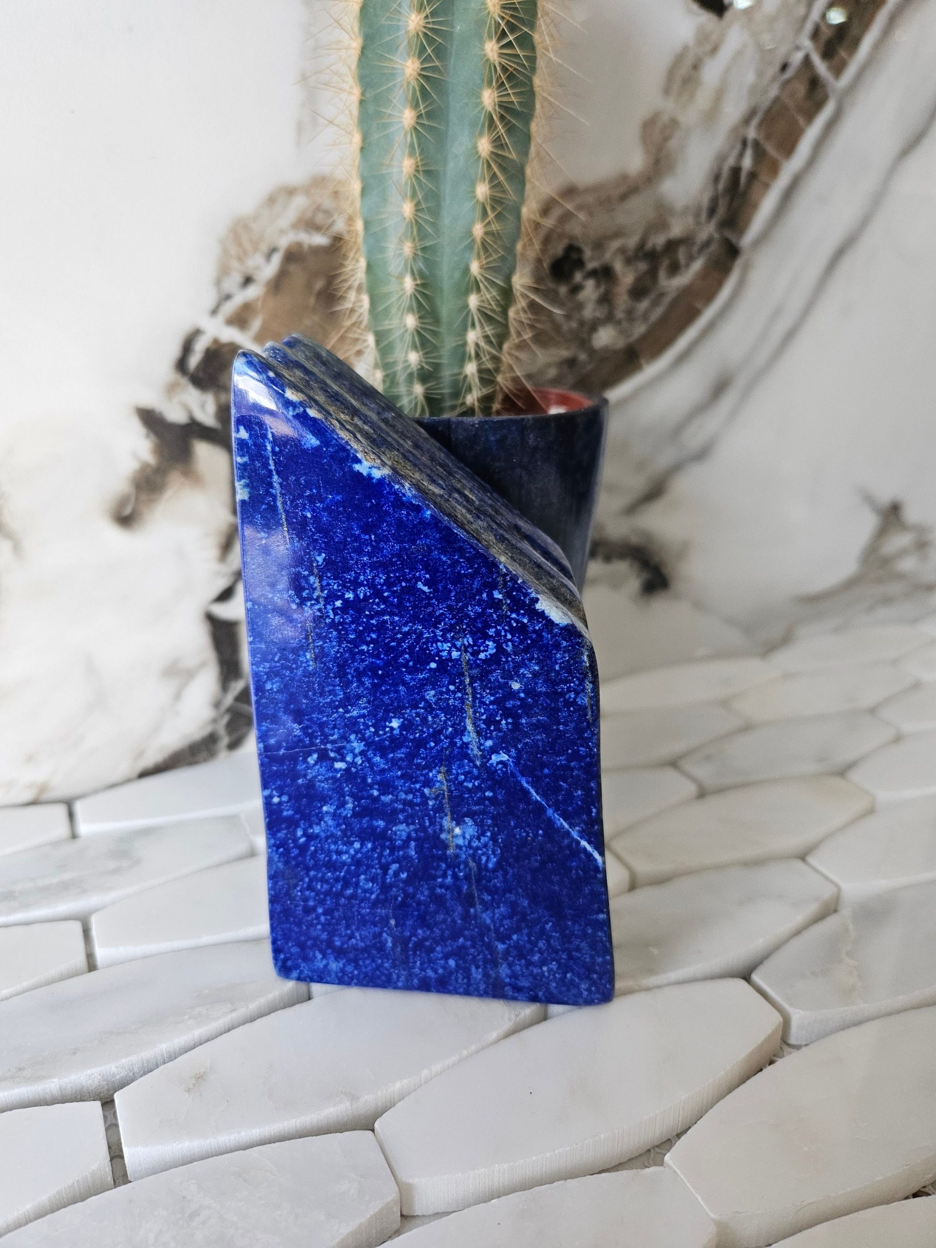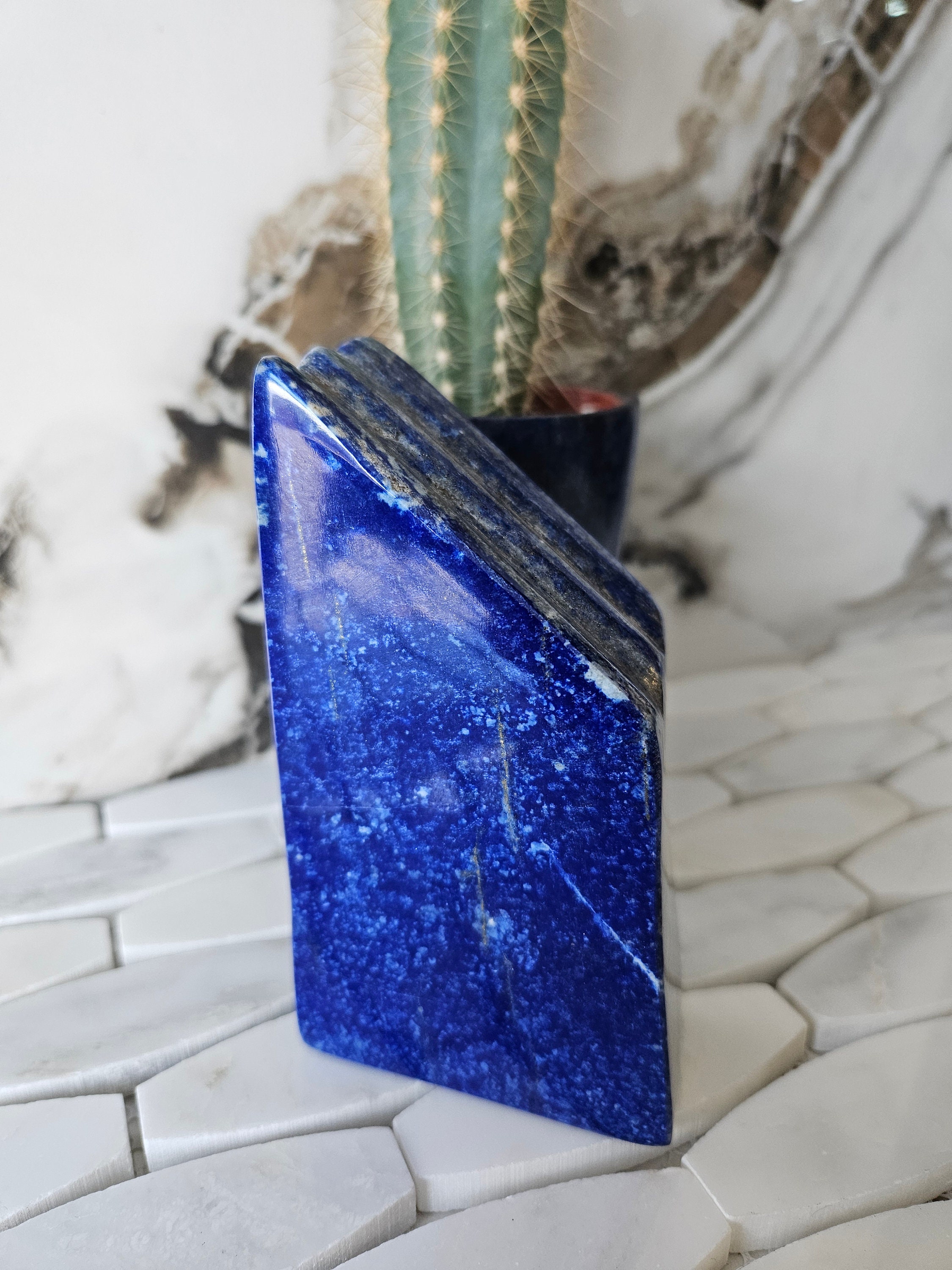 Its free-form shape allows it to be displayed in a variety of ways, making it a versatile addition to any home or office. Whether you are a collector of fine gemstones or simply appreciate the beauty of natural materials, this lapis lazuli is sure to delight and impress.