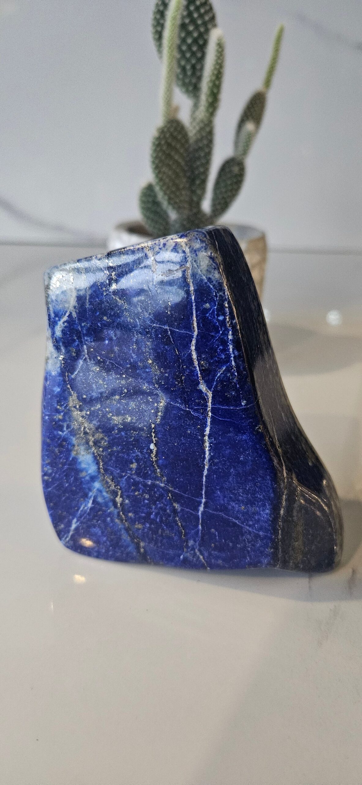 Its free-form shape allows it to be displayed in a variety of ways, making it a versatile addition to any home or office. Whether you are a collector of fine gemstones or simply appreciate the beauty of natural materials, this lapis lazuli is sure to delight and impress.