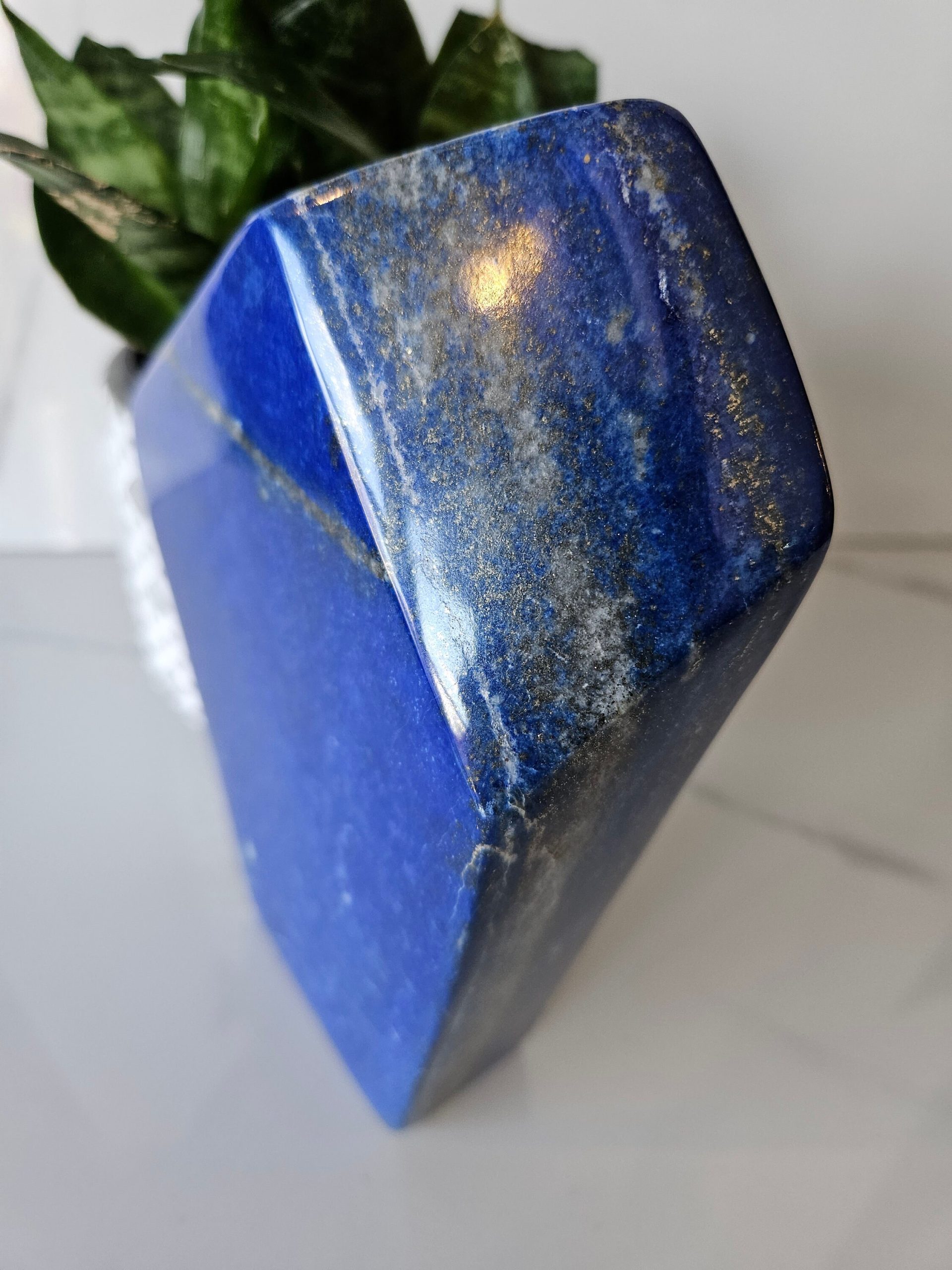 This royal blue crystal features subtle pyrite streaks, giving it a metallic flash.